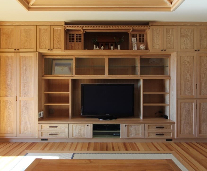 施主さまが溜めていた銘木達に日の目を見せるために作った家具と建具です。