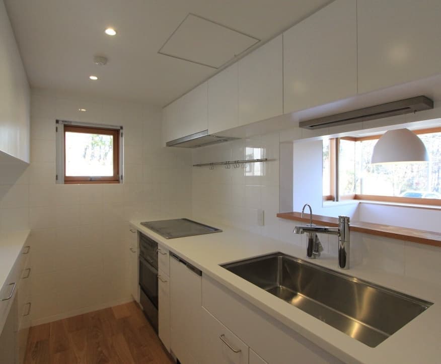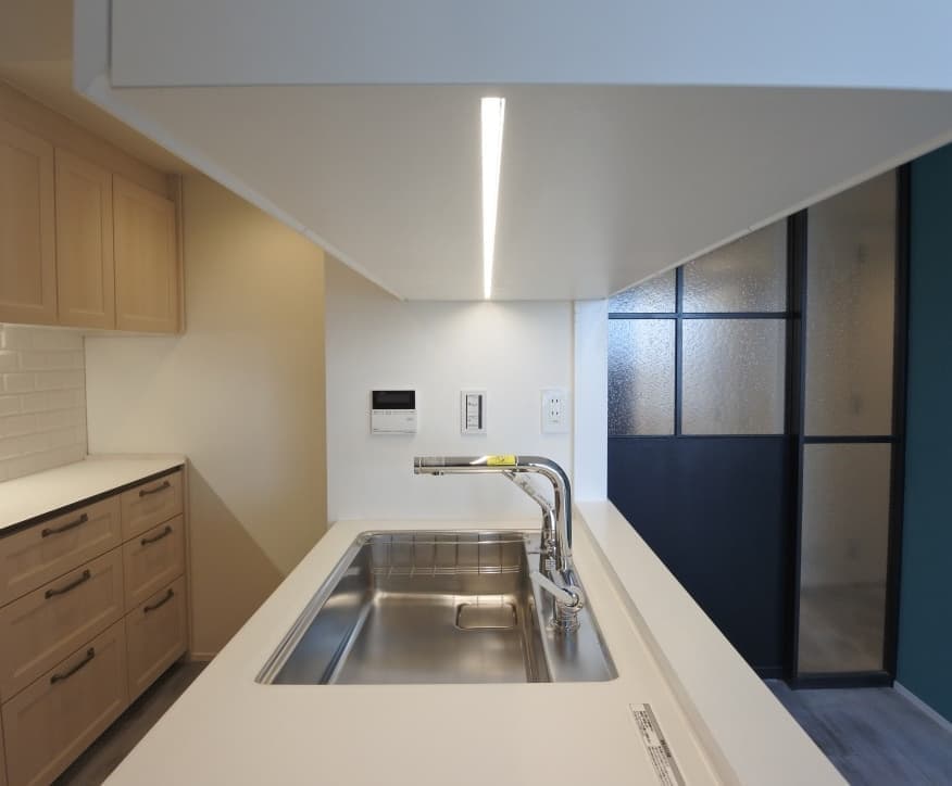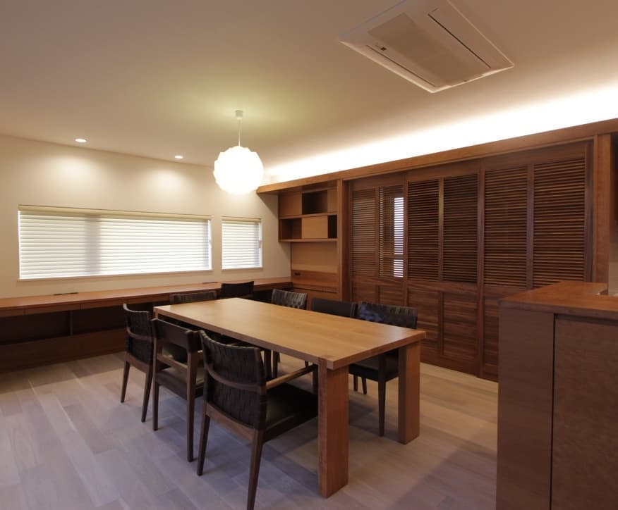 キッチン廻り、洗面化粧室廻り、窓際のベンチなどを製作させていただきました。中でも、リビングボードを間仕切り壁として寝室と空間分けをした造付家具は圧巻です!