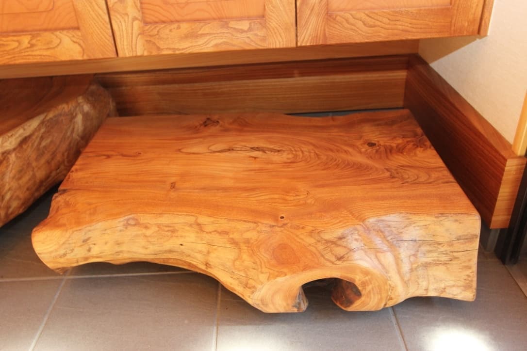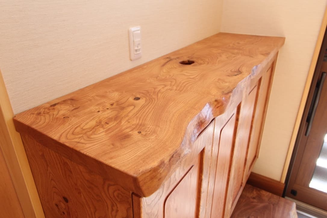 河原を散歩していたら何やら良さそうな丸太が流れ落ちているのを発見。持ち帰っていろいろ調べてみると雷神木という木。新築するときにこの木を使ってみたいというのが夢だったとのことで承りました。この材料で何を創るか、いろいろ話を進め最終的に自分の大事な物を仕舞うための収納家具にすることに。