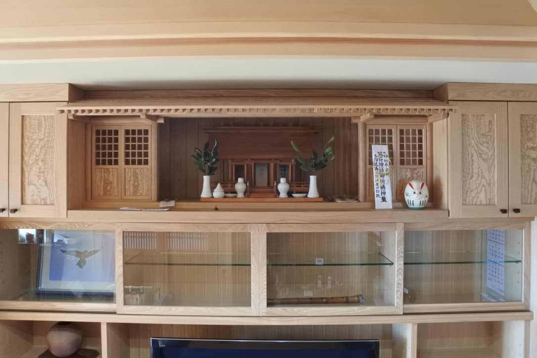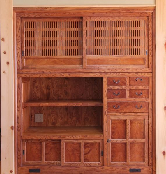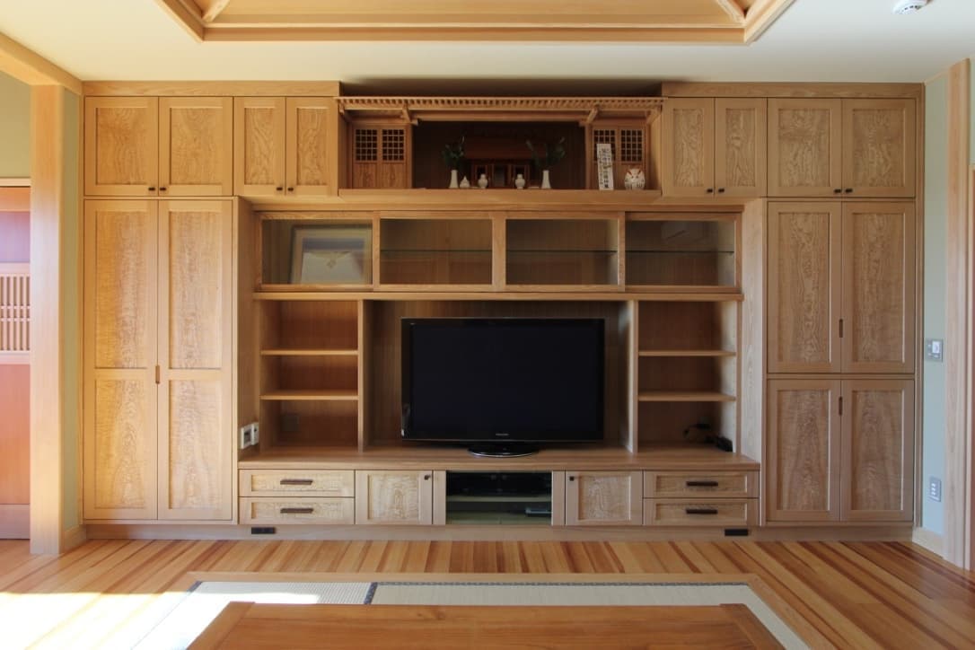 話が進んでいく中で5メートル40センチの面にTVボードの面に仏壇、神棚、自分の好きなお酒を飾るスペース、他収納の機能を持つビルトイン家具も作りたい、建具も全て銘木で作りたいとなり大変な大仕事となりました。