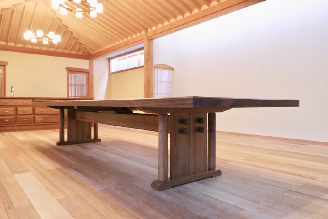 無垢材を使用した家具は、化粧板ものと違う難しさがあります。原木製材から関わり乾燥、適材適所の木取り、そして、製作、取付に至るまでを熟練の職人が責任を持って関わっていきます。最後は、家具専門の塗装職人が家具に生気を与えます。熟練の職人は、昔ながらのニカワによる接着技術も持っており、文化財や古くなった家具の補修なども関わることが可能です。