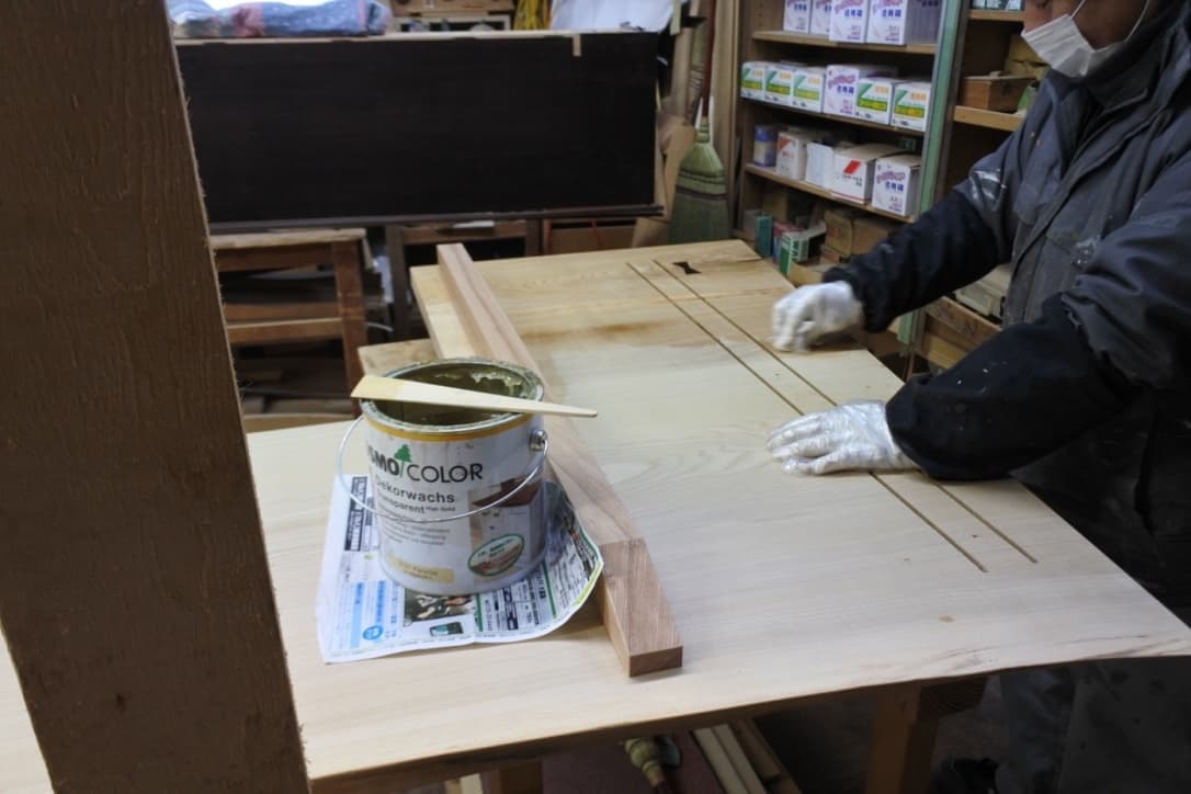 弊社には、家具専門の塗装職人がおります。塗装は、家具の最終の善し悪しを決定づける非常に重要な工程です。その工程が自社に控えていることは、お客様の満足度をさらに高めるお役に立っています。弊社の塗装は、ポリウレタン塗装、オイル拭きなどが主です。